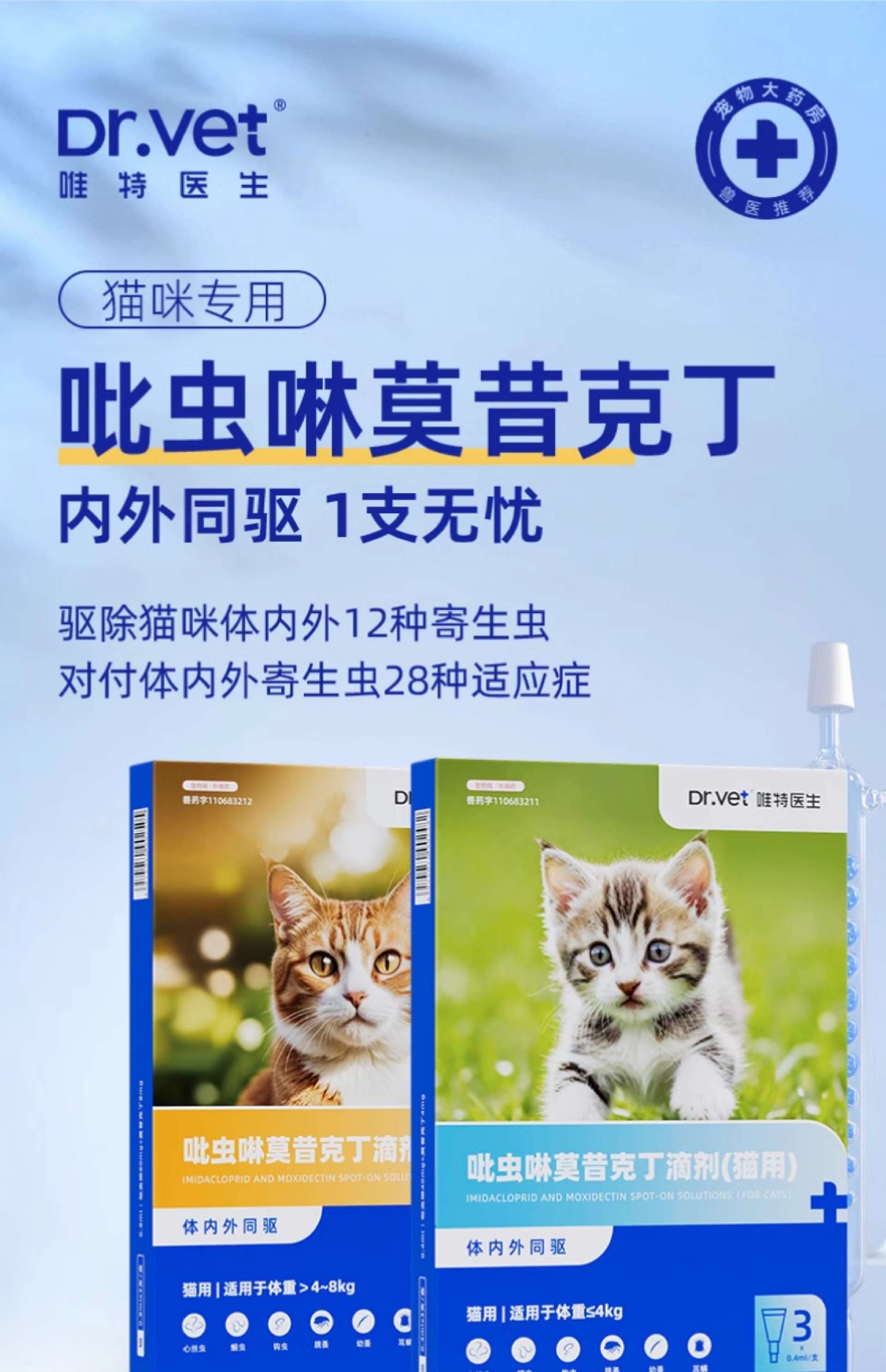 唯特医生、猫咪驱虫药、狗狗驱虫药、体内外一体、除跳蚤耳螨、犬猫外驱滴剂