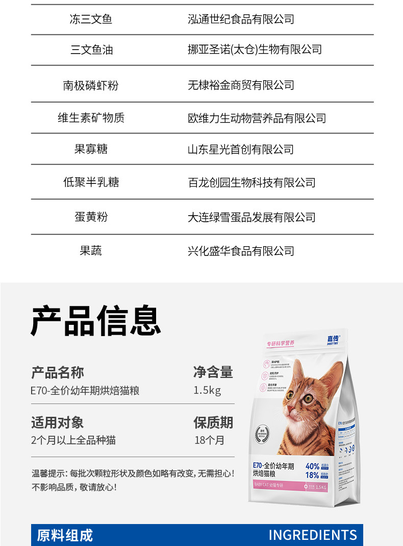 嘉传E70、烘焙猫粮、全价无谷、幼猫、孕猫、专用猫粮