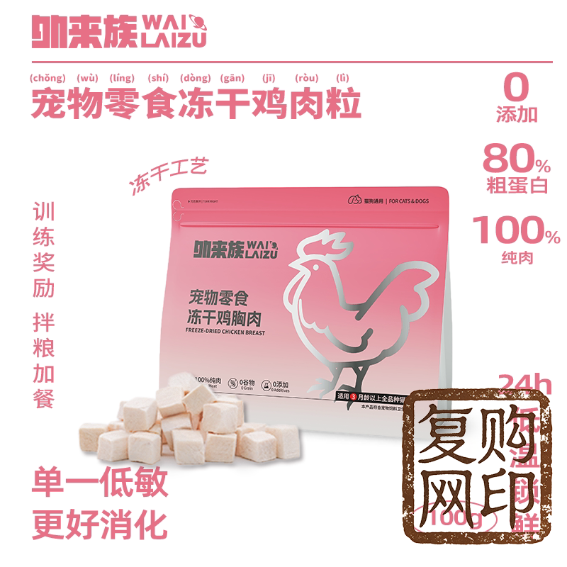 * 冻干鸡肉粒为宠物零食,不可替代主粮。训练时请配合清水给宝贝充足饮水。感谢信任,愿每一只猫狗都被温柔以待