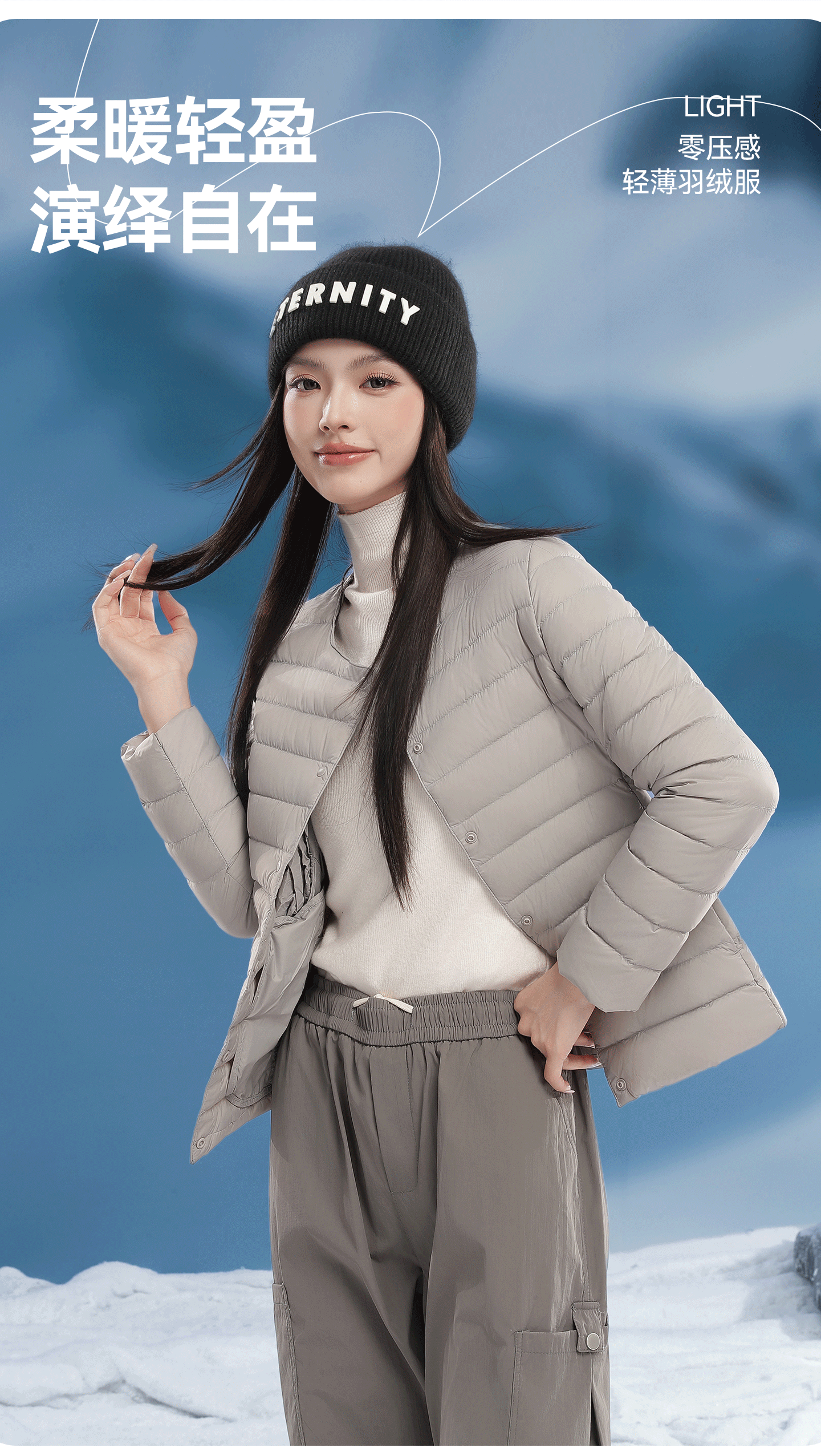 拉夏贝尔、轻薄羽绒服、女士短款、冬季、韩版修身、圆领无领、保暖外套