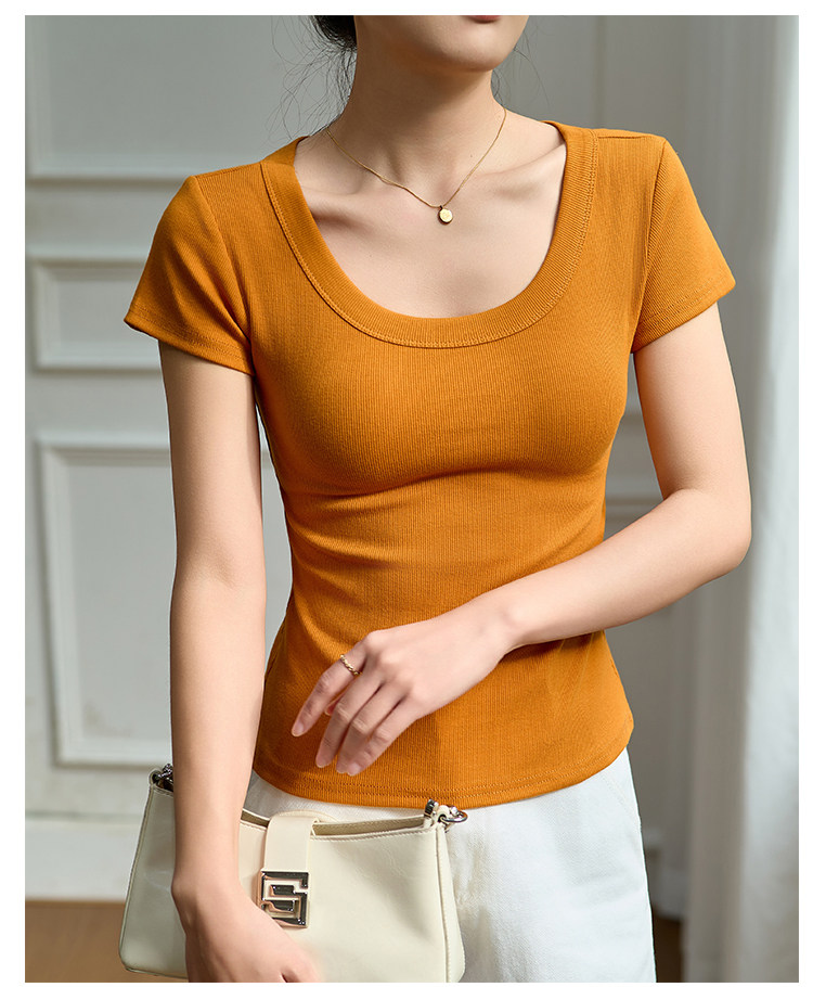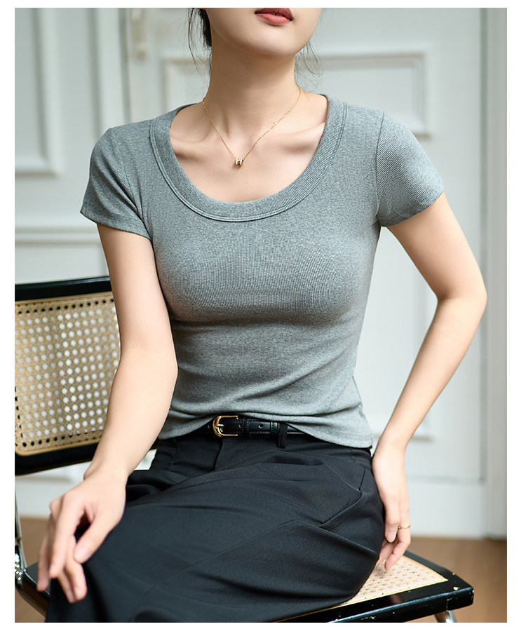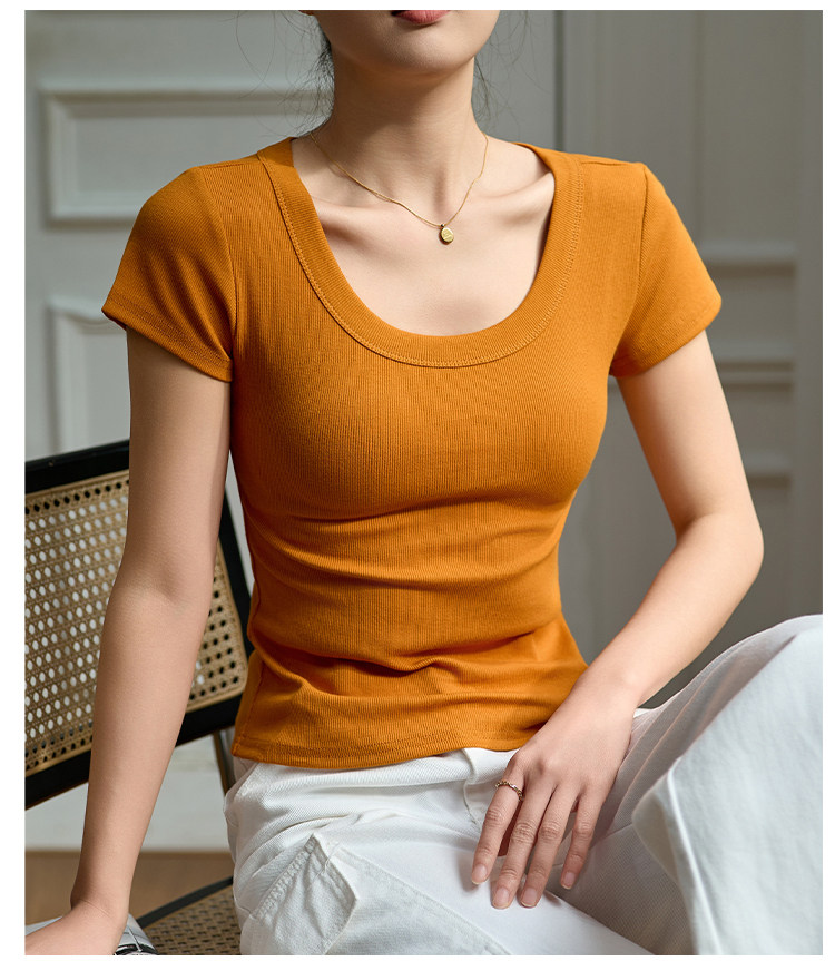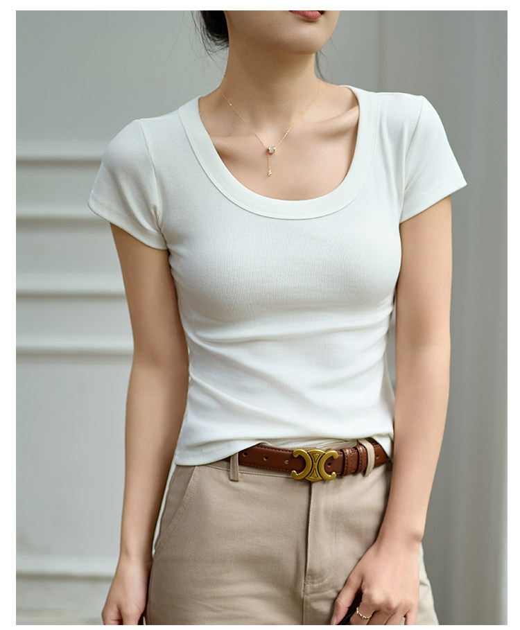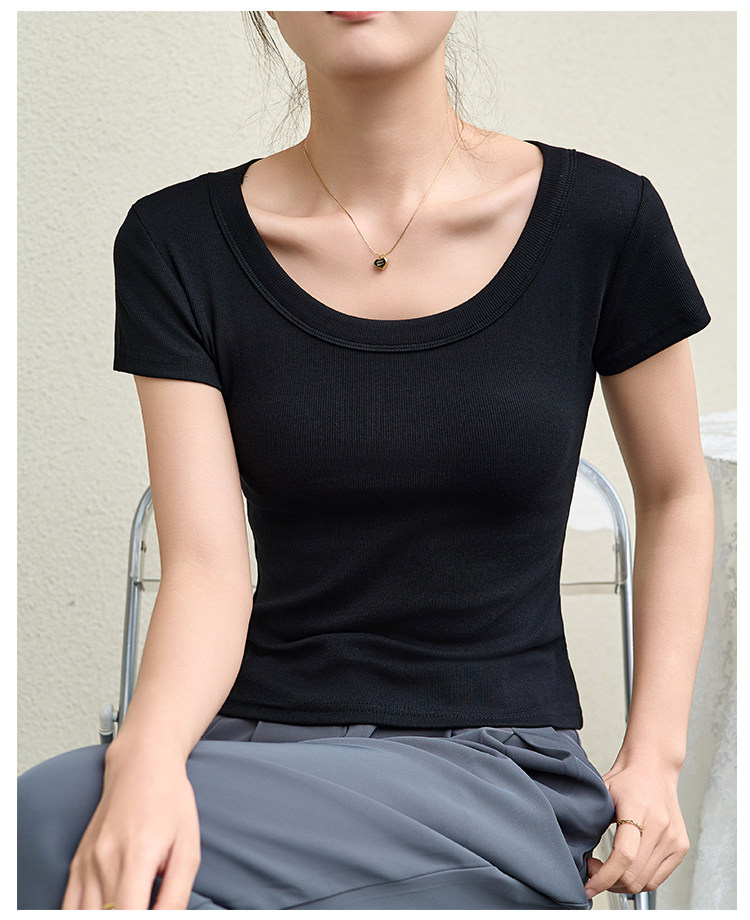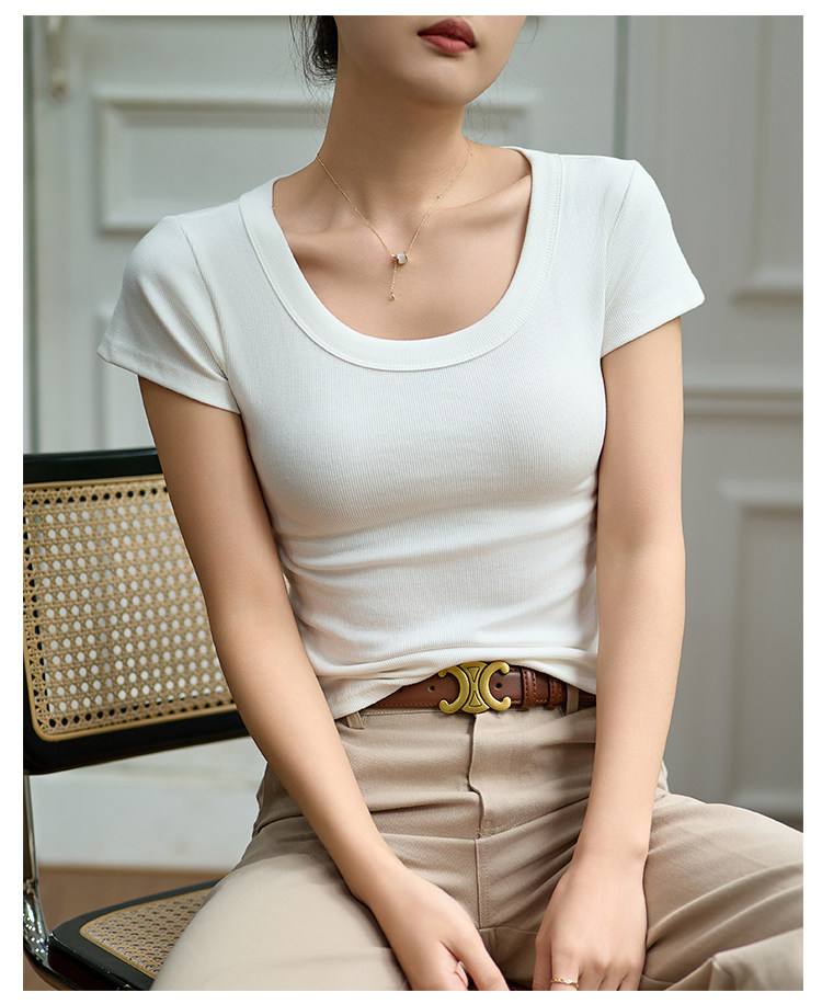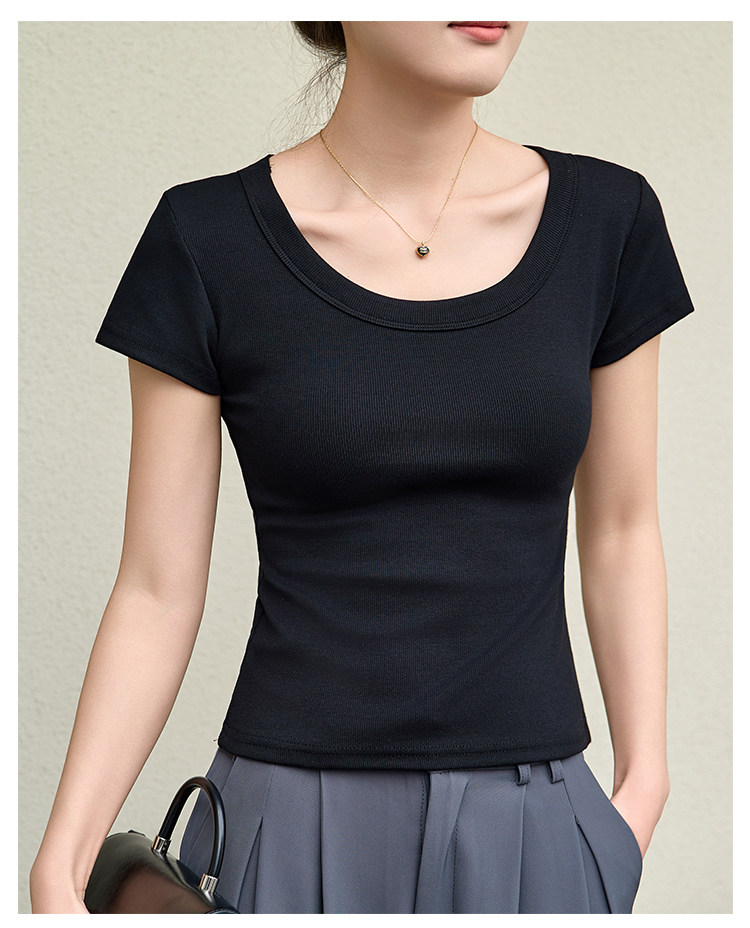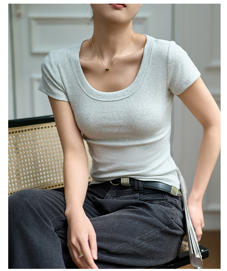 纯棉 U 领、正肩短袖、2026 新款、夏季低领、纯色上衣、修身显瘦