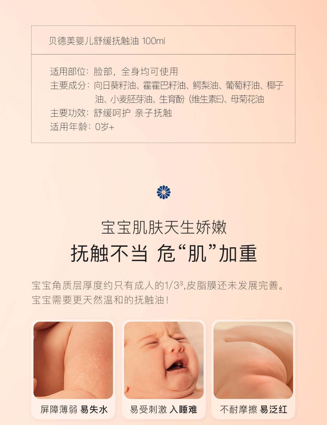 贝德美 婴儿专用抚触油 新生宝宝按摩油 天然 呵护滋润 保湿 儿童润肤油