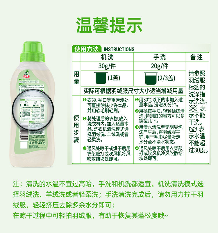 水卫士、羽绒服洗衣液、柔软蓬松、防静电、除菌除螨、去污