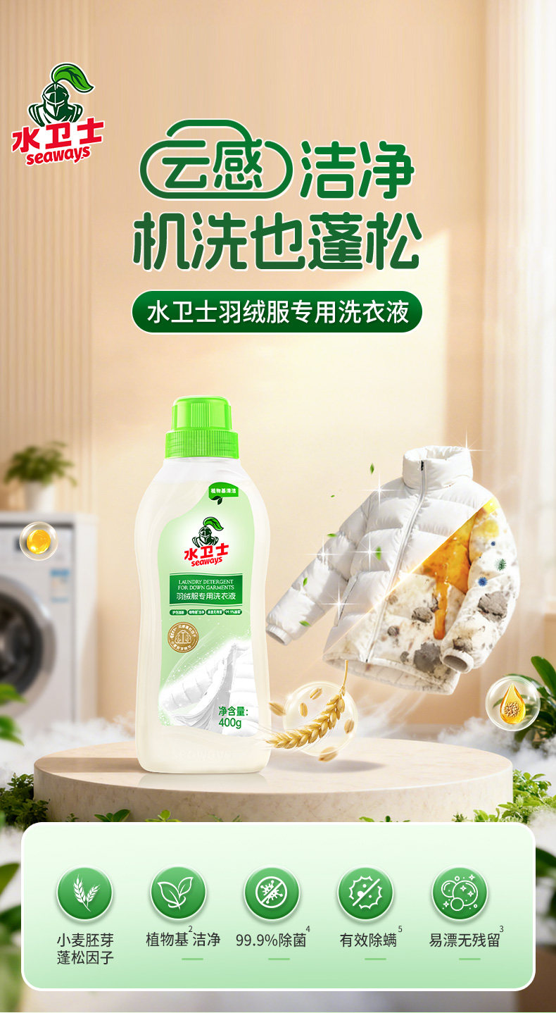 水卫士、羽绒服洗衣液、柔软蓬松、防静电、除菌除螨、去污