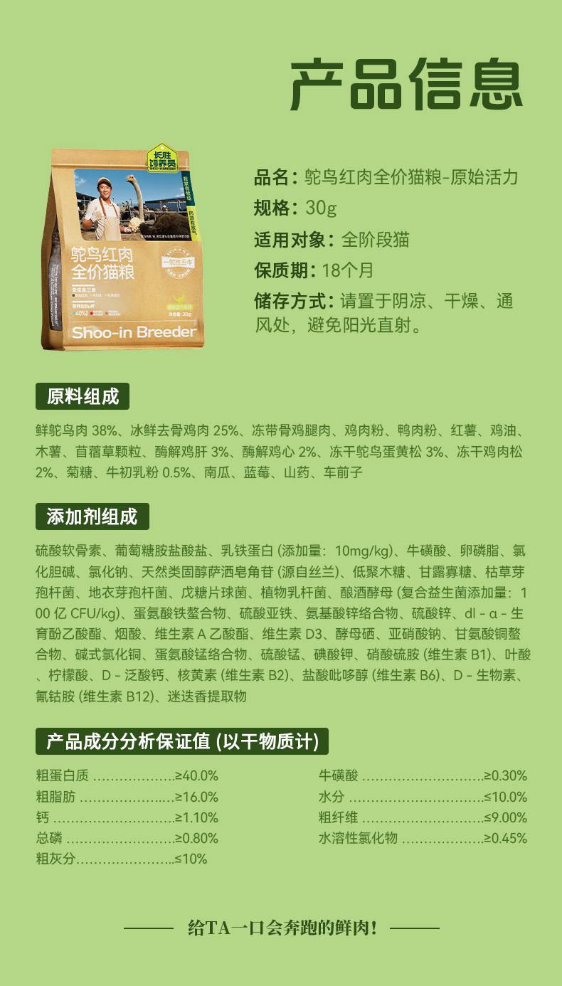 长胜饲养员鸵鸟肉全价猫粮成猫幼猫全阶段通用试吃装30g*5包