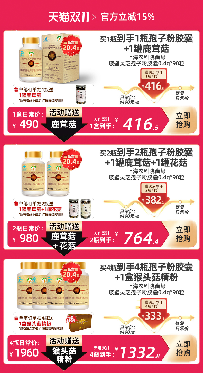 上海农科院、尚绿金盒、破壁灵芝孢子粉胶囊、增强免疫力、90粒/瓶、优惠