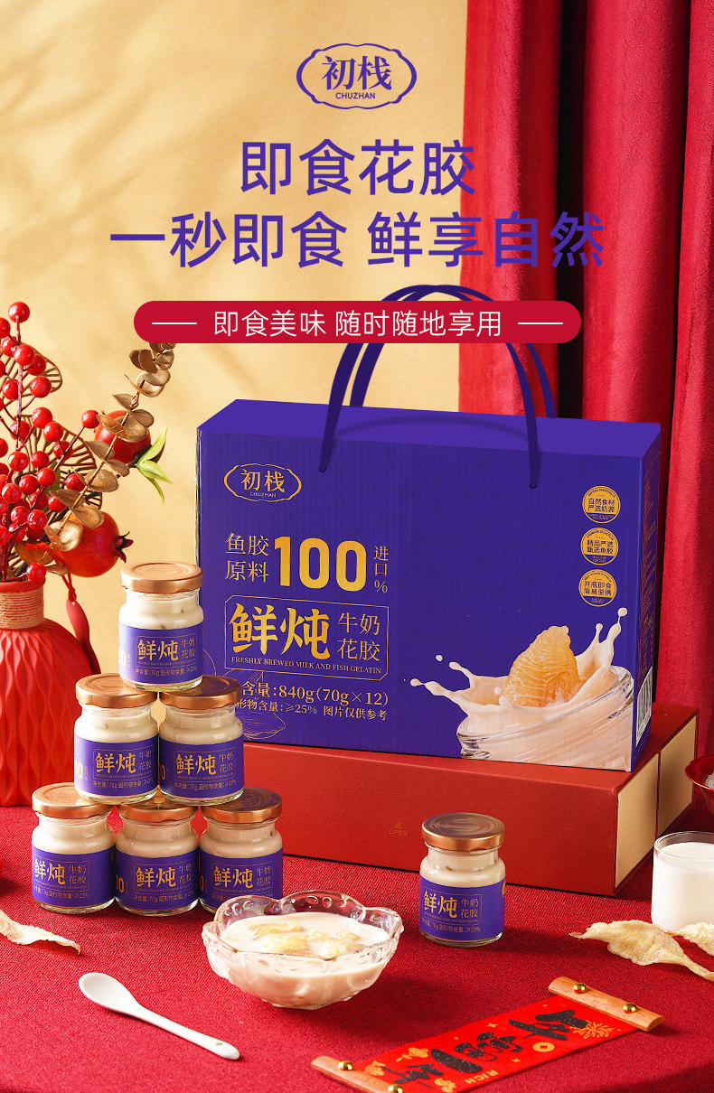 初栈 年货送礼 鲜炖牛奶花胶 12瓶 即食免煮 代餐速食粥 孕妇礼盒装