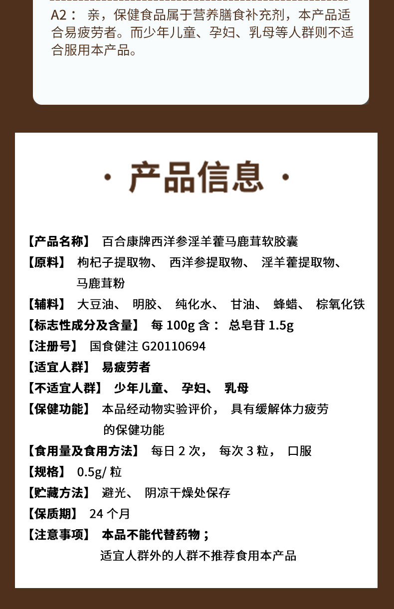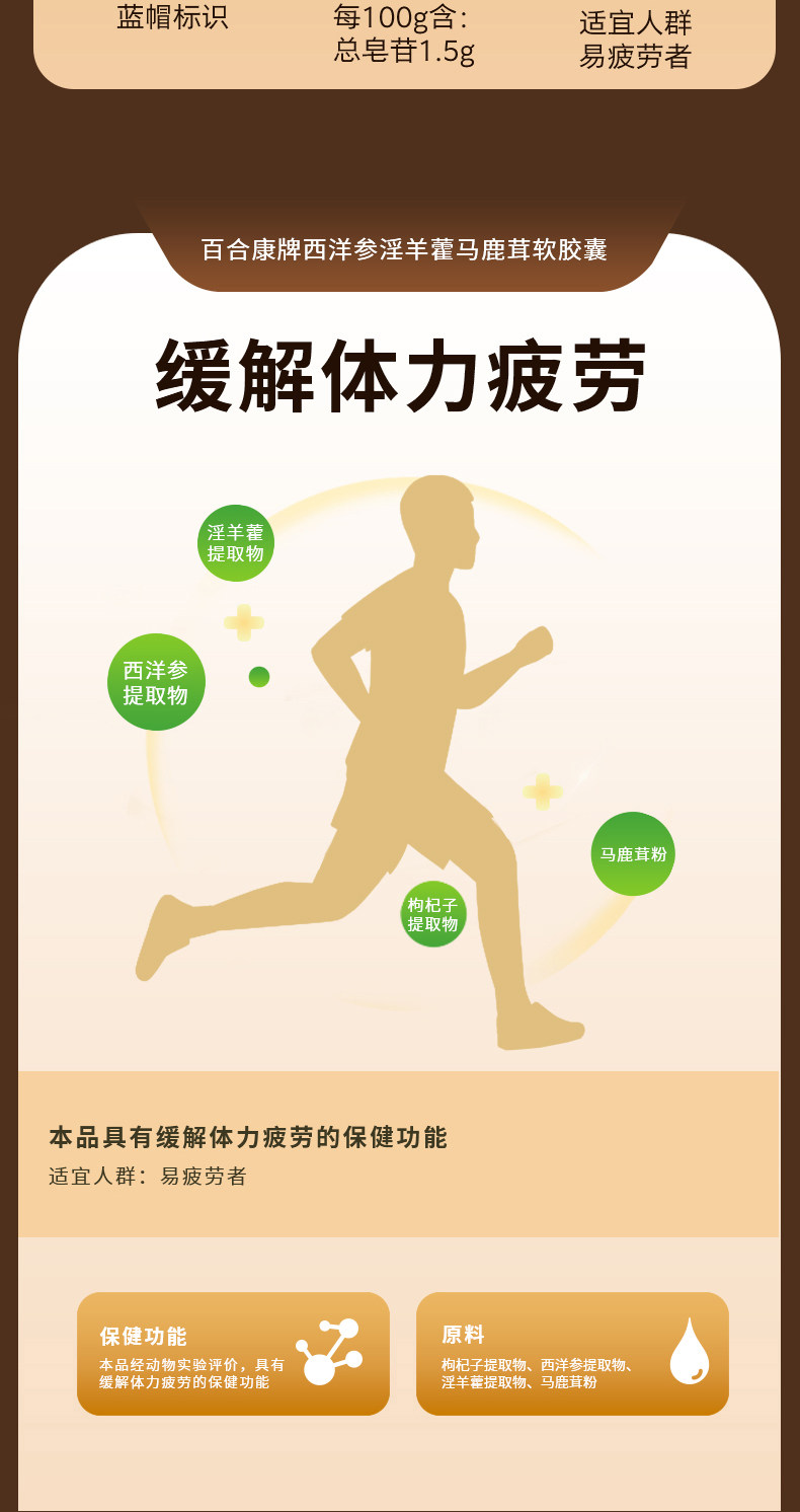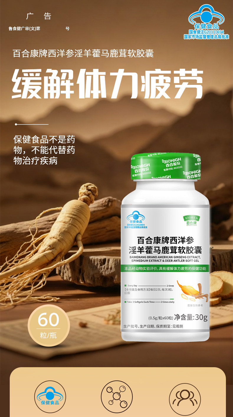 百合康牌、西洋参淫羊藿马鹿茸软胶囊、缓解体力疲劳、保健品
