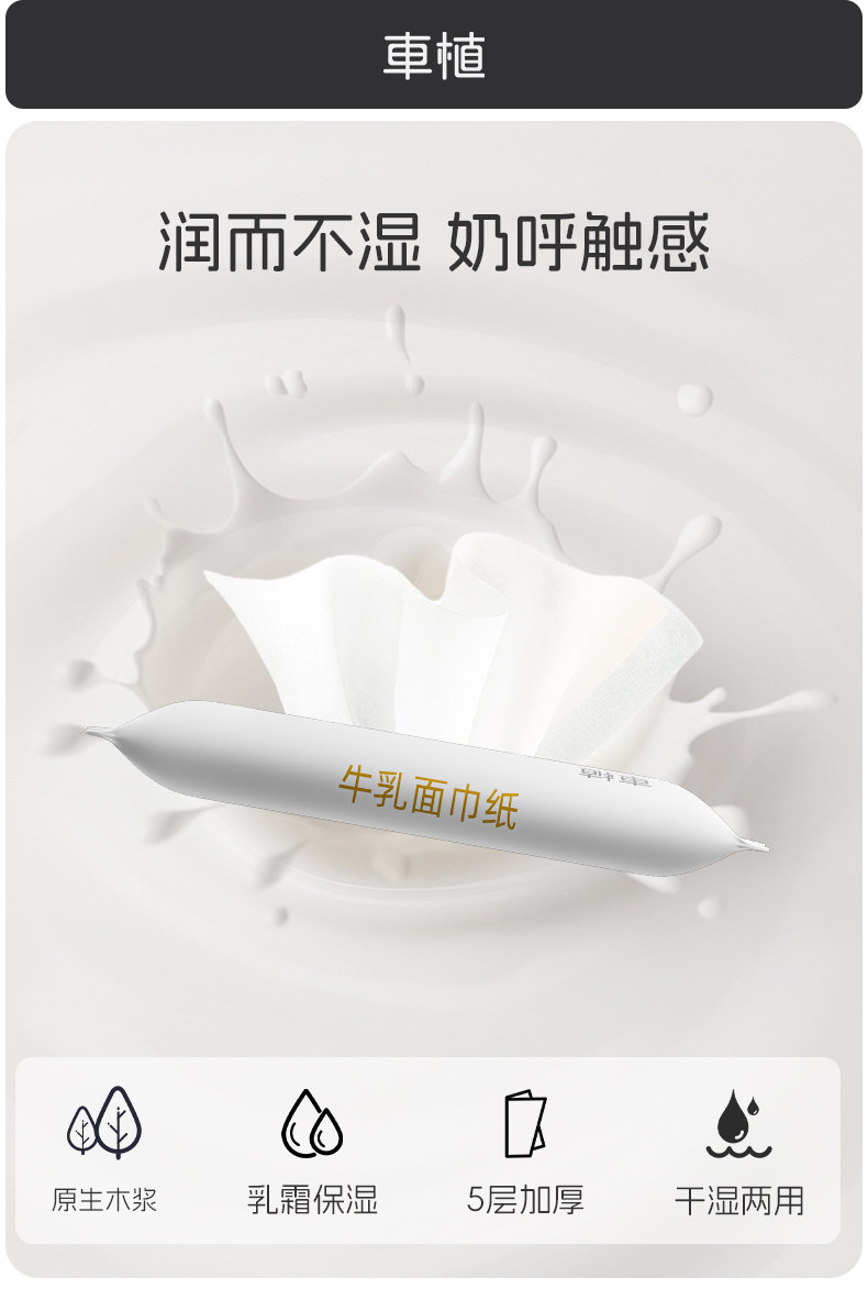 车植乳霜抽纸巾、牛乳纸、小包、母婴可用、车载、干湿两用、5层加厚超柔