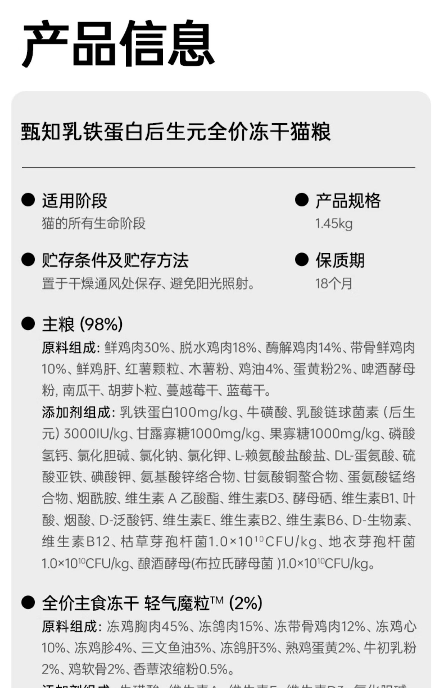甄知、幼猫成猫、冻干无谷、全价鲜肉、猫主粮、益生菌、肠胃、鱼油美毛