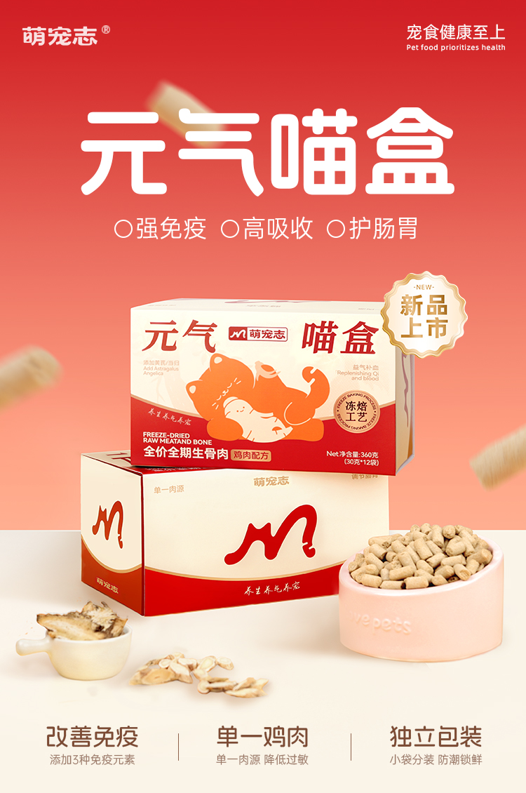 萌宠志、元气喵盒、全价全期、免疫生骨肉、冻焙主食冻干、猫粮、成幼猫