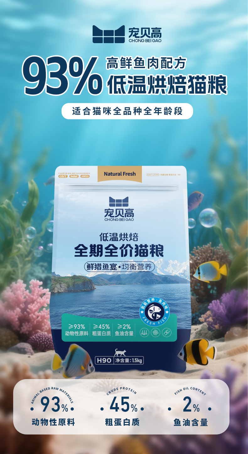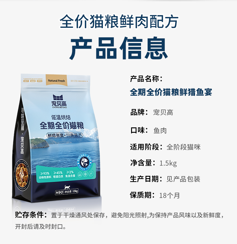 宠贝高、全期全价、低温烘焙猫粮、无谷、鱼肉味、高肉营养主食