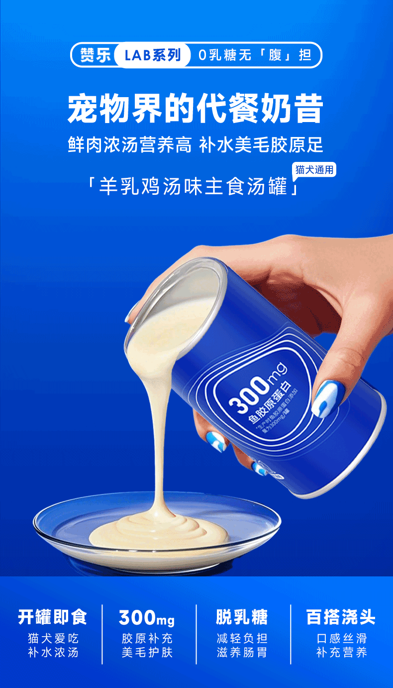 赞乐主食、羊奶汤罐、浓汤奶昔罐、鱼胶原蛋白、补水猫狗粮、营养湿粮、0乳糖