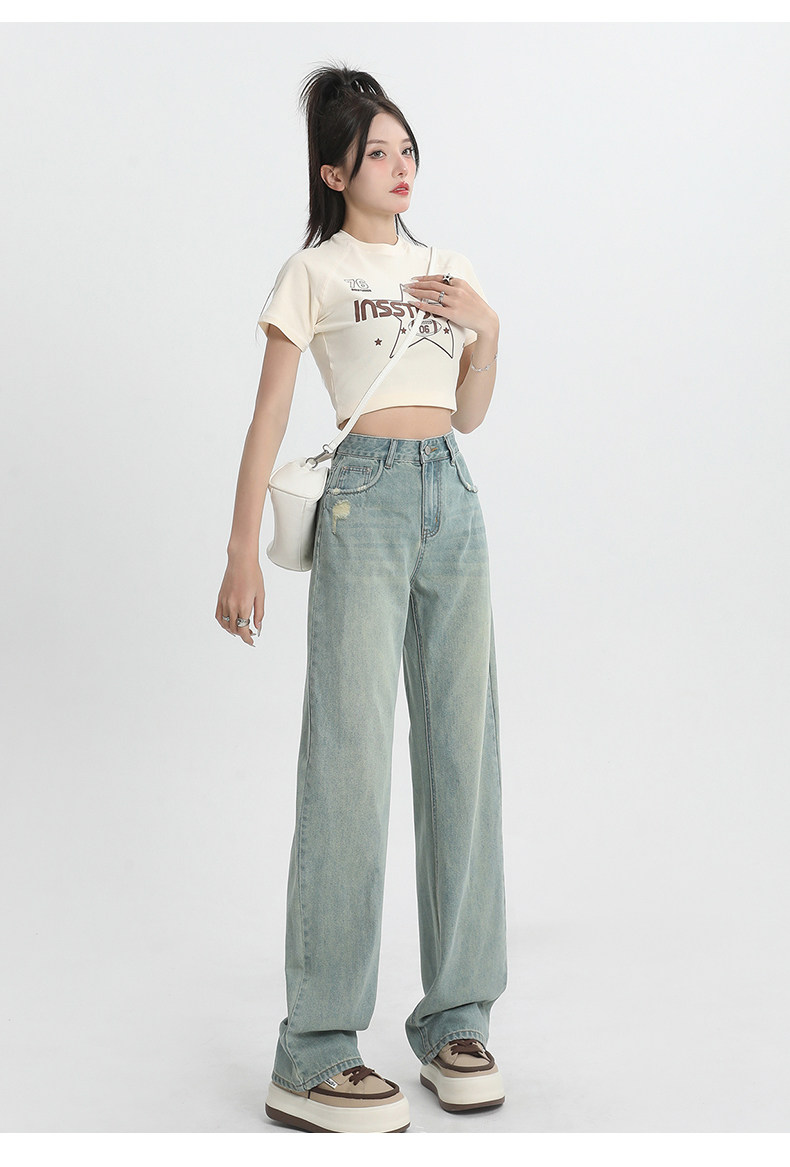 浅蓝 复古 窄版 阔腿 牛仔裤 春装 2024款 高腰 显瘦 直筒裤