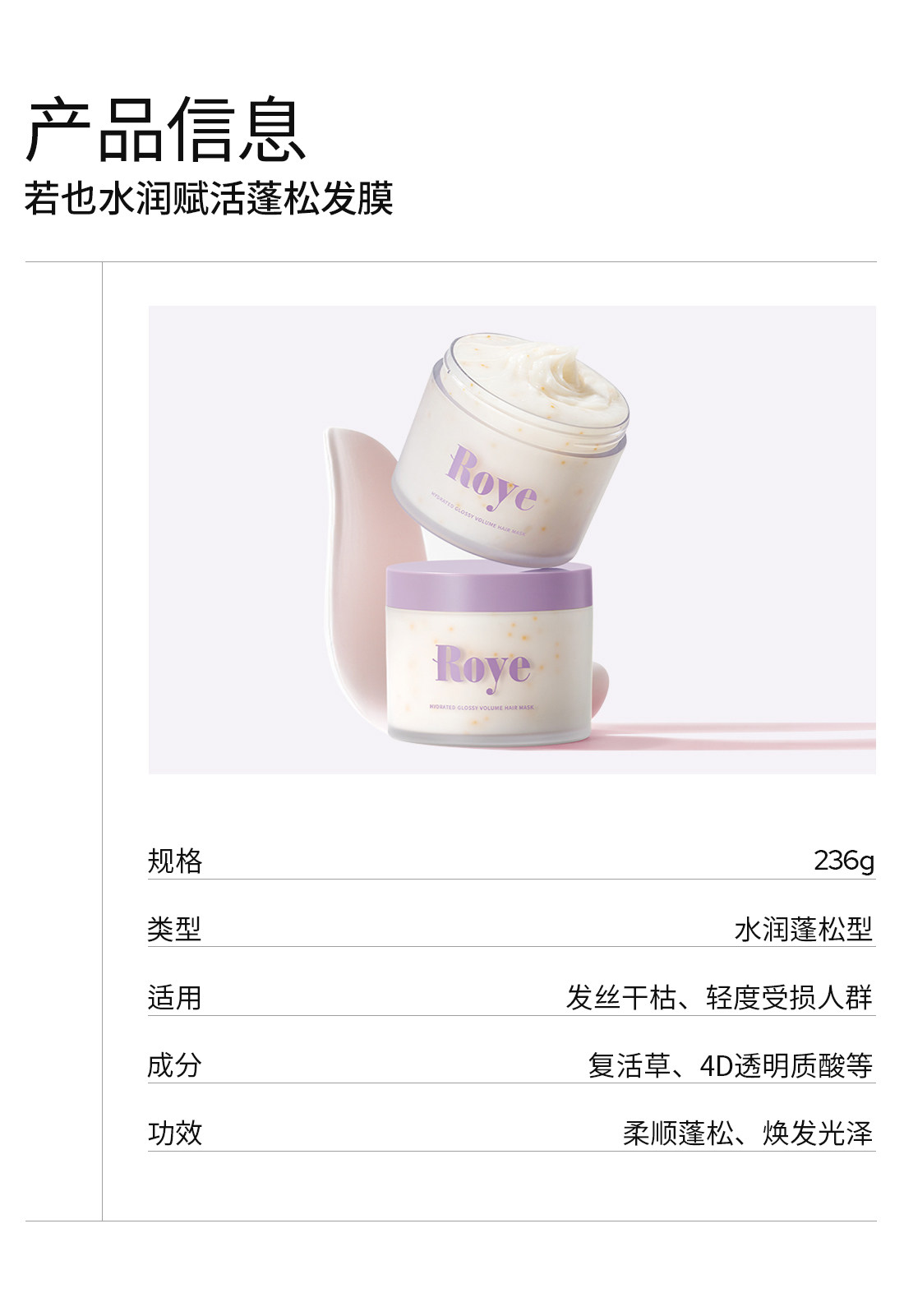 Roye若也、蓬松发膜、蛋白修护、干枯毛躁、受损补水、柔顺滋养