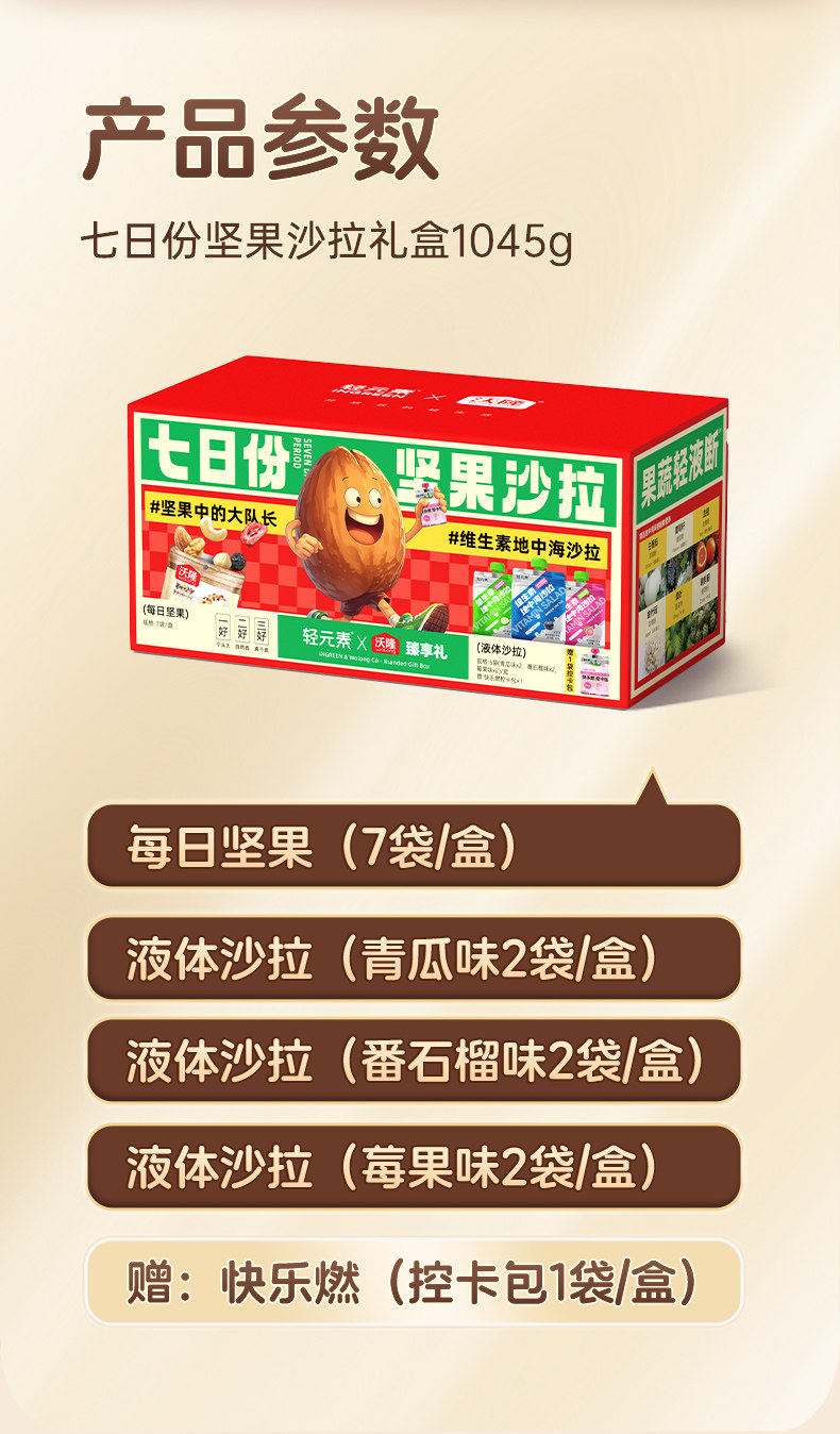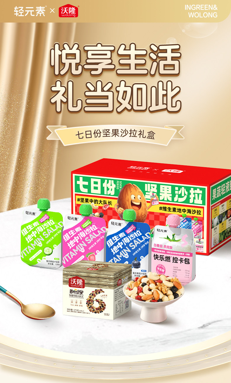 沃隆、七日份、坚果液体沙拉、礼盒饮料、膳食纤维、腰果混合、巴旦木