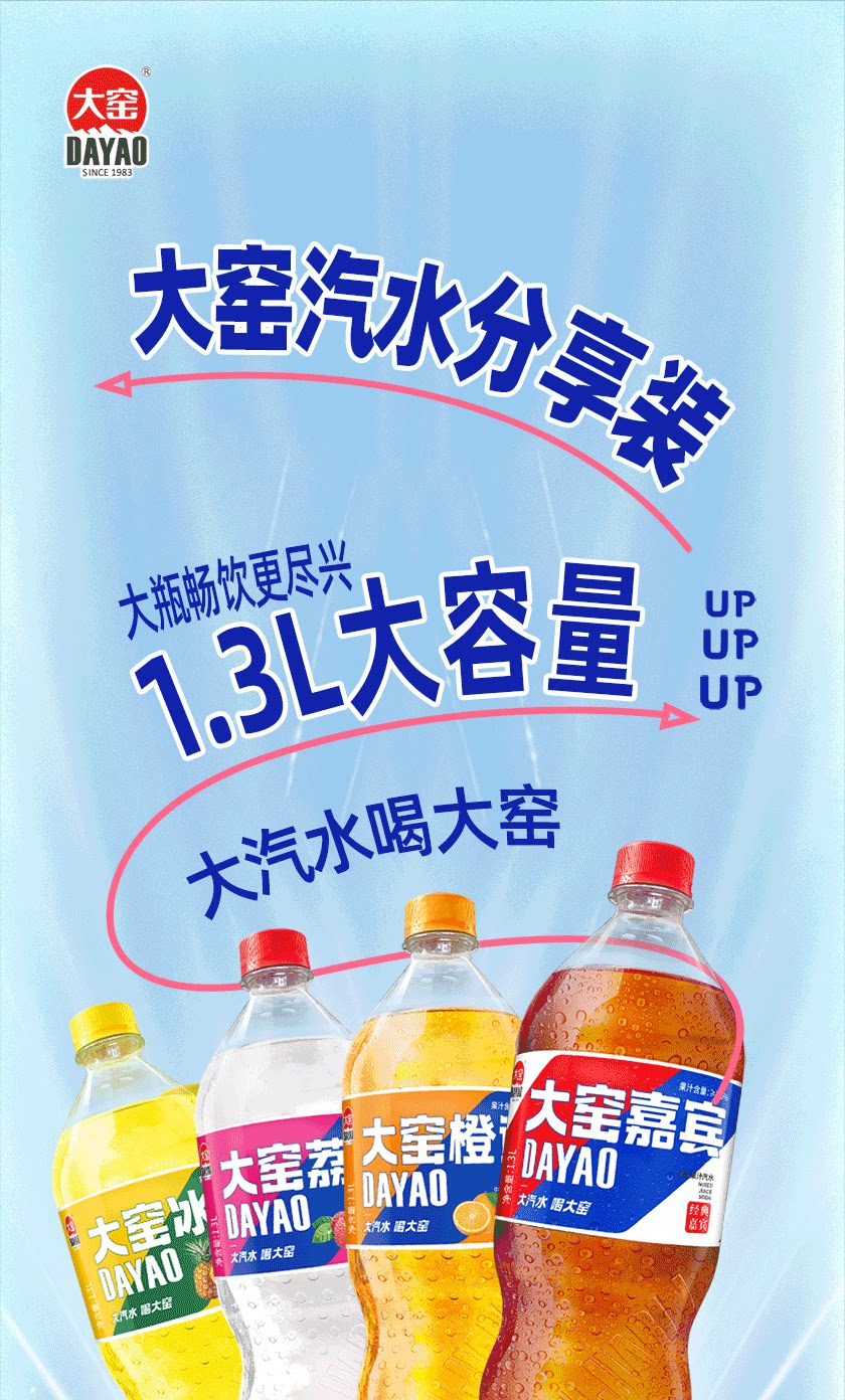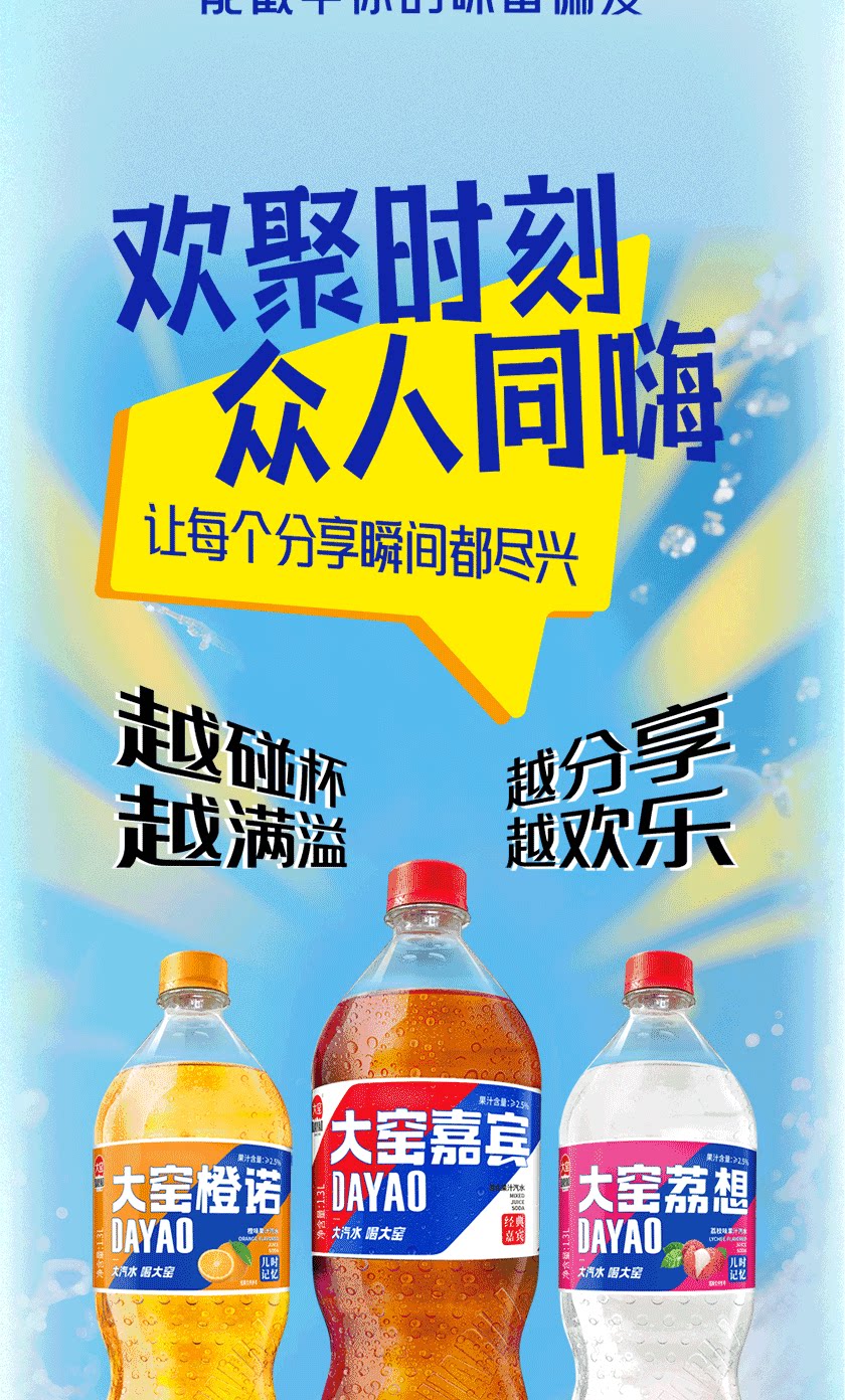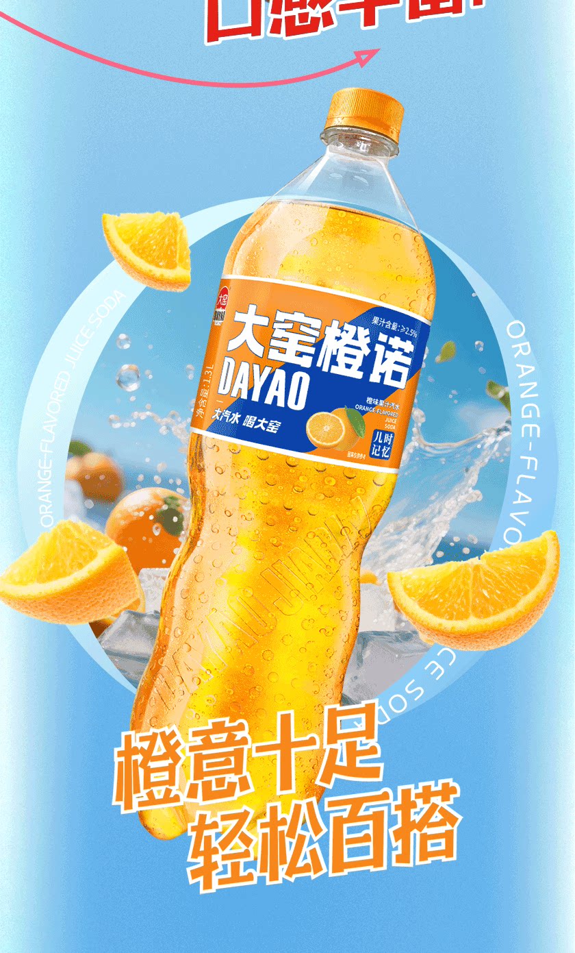 吴京代言、大窑果汁汽水、嘉宾橙诺、碳酸饮料、1.3L分享装、2瓶