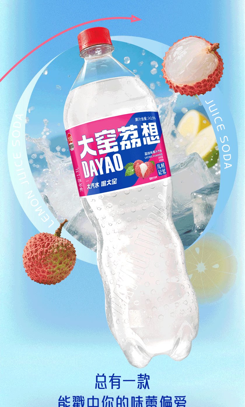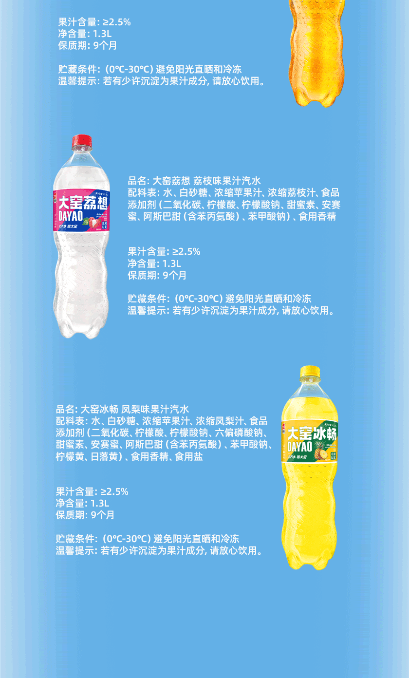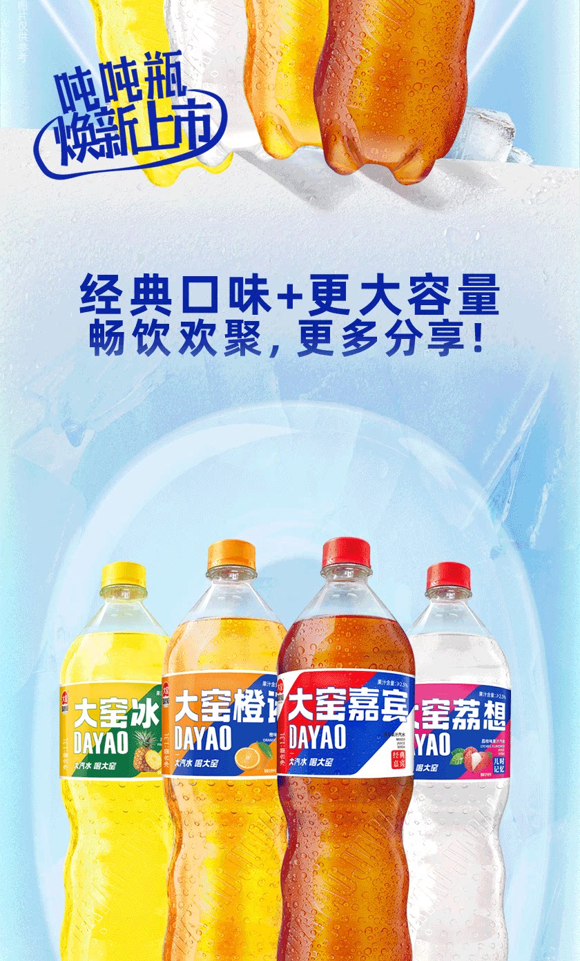 吴京代言、大窑果汁汽水、嘉宾橙诺、碳酸饮料、1.3L分享装、2瓶