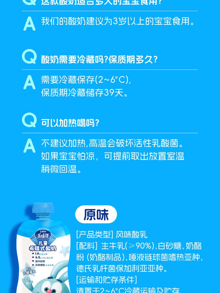 lakto乐味可儿童希腊酸奶4.5g蛋白低温酸奶8袋/盒