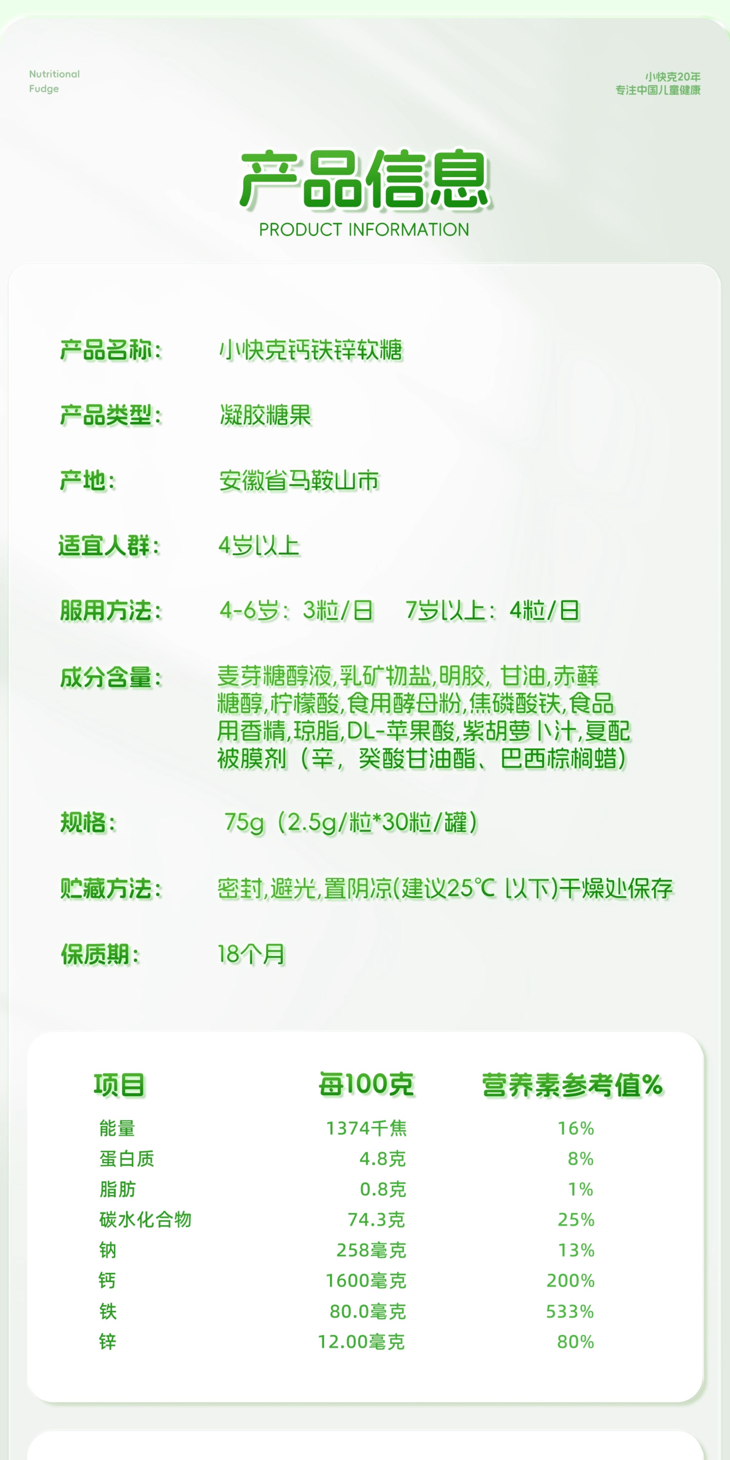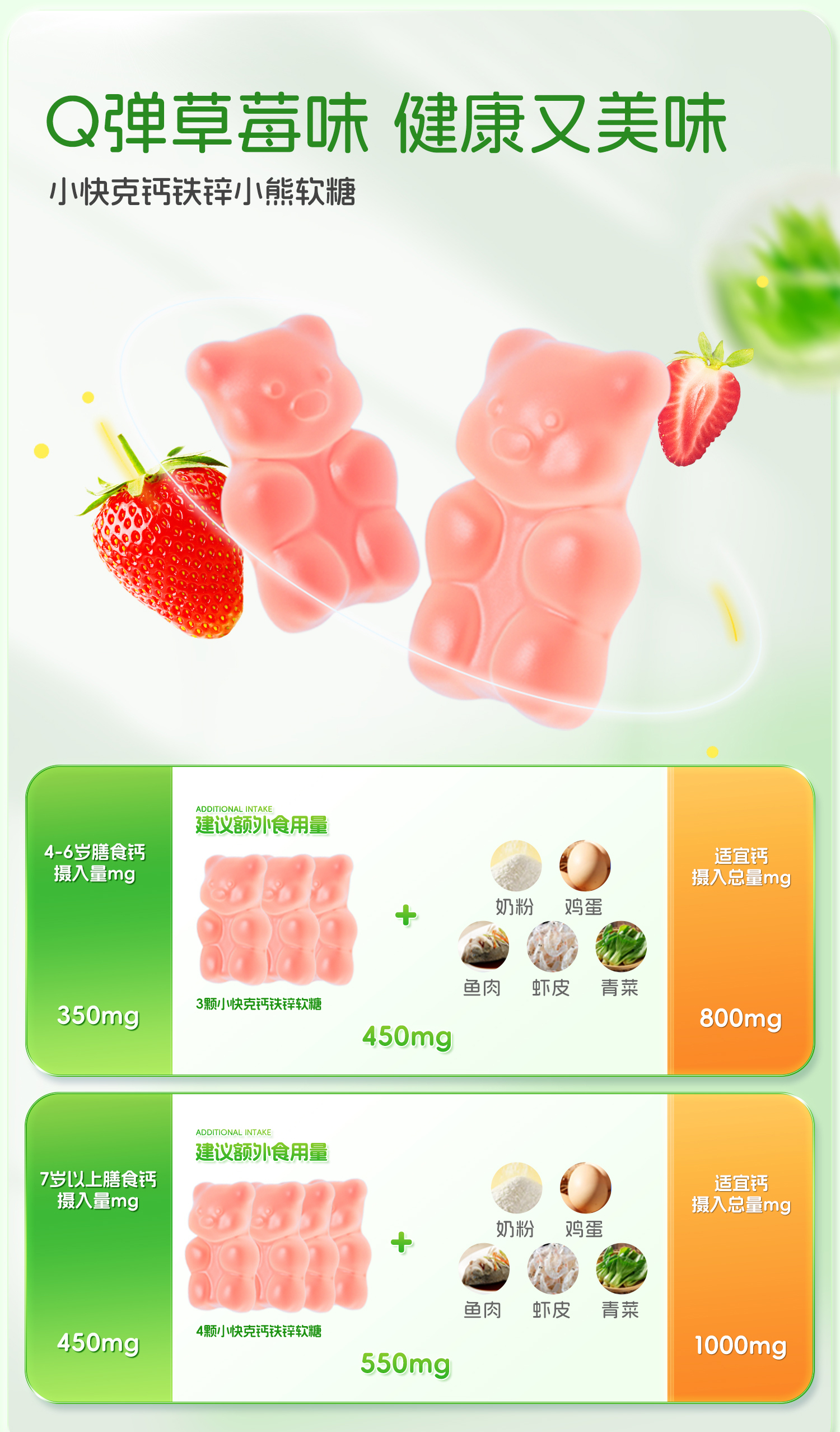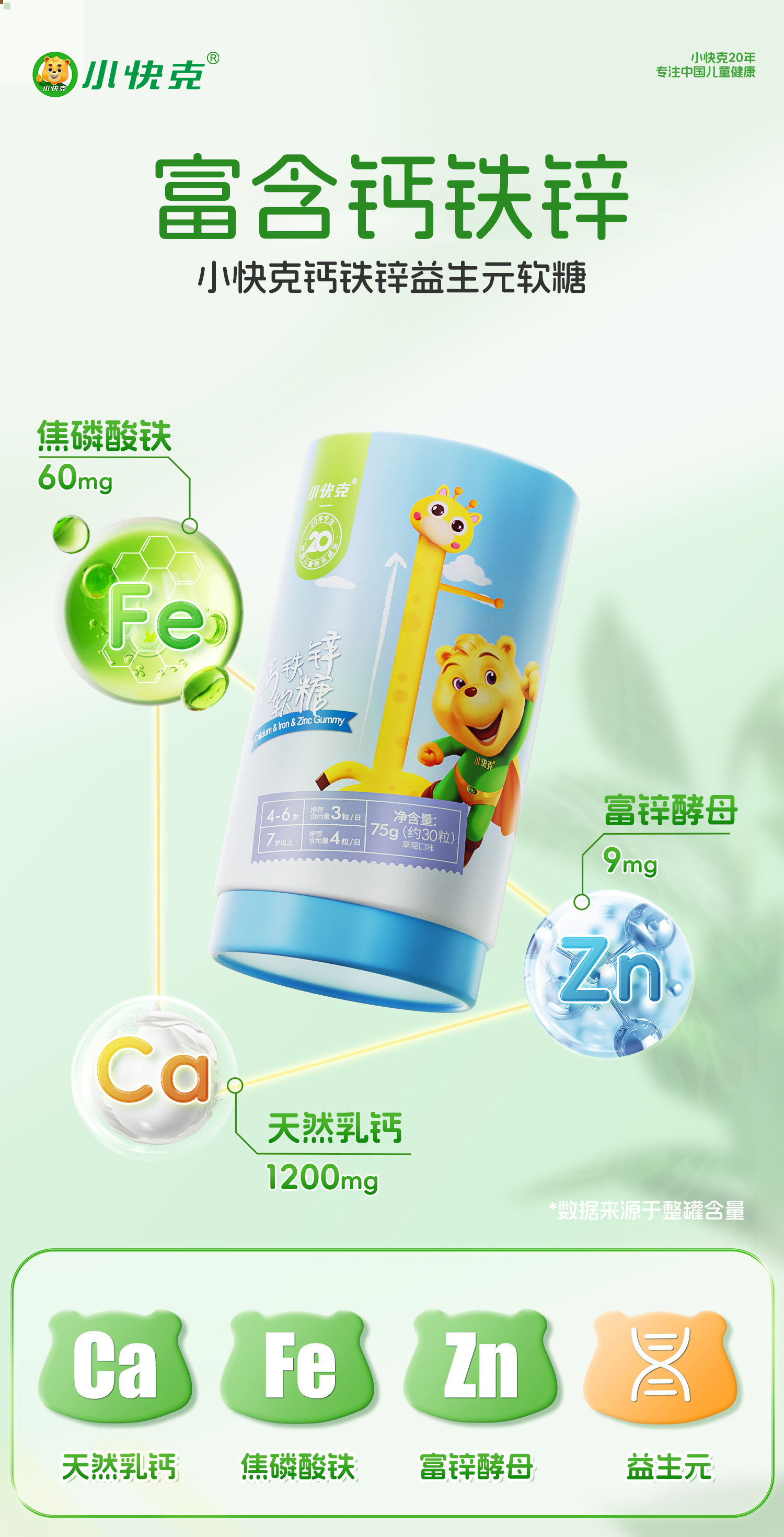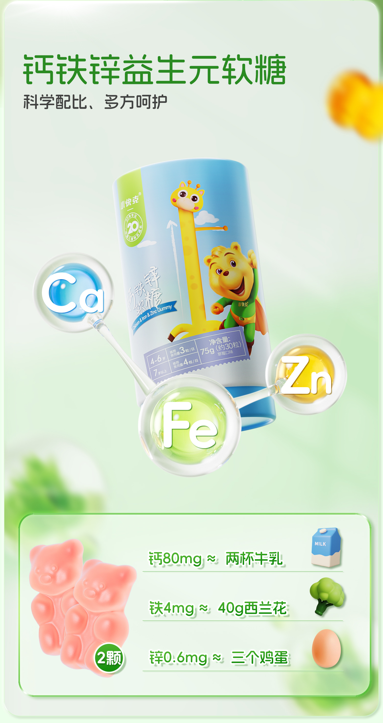 小快克、儿童钙铁锌软糖、维生素、多种营养、3岁+宝宝、成长、含钙铁锌